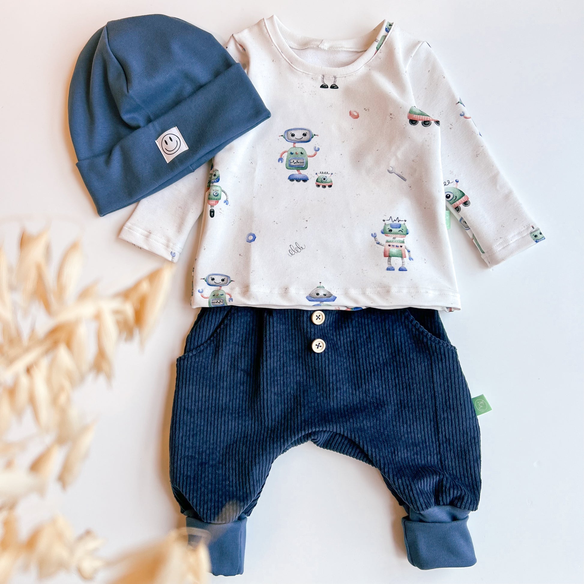 Das Baby und Kind Set besteht aus einem Bio Baumwoll T-shirt und einer Mitwachhose aus weichem Cord in blau. Der handgemachte Roboter verleiht dem Set das gewisse Etwas und ist mit einem exklusiven Druck versehen. Ideal für den Frühling, da die Hose mitwächst und somit länger getragen werden kann. Ein perfektes Set für kleine Roboter-Fans.