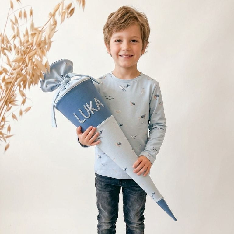 Diese wunderschöne Schultüte in der Farbe Jeansblau ist ein besonderes Highlight für den ersten Schultag. Der liebevoll gestaltete Stoff mit Walen wurde exklusiv von Mimor Kids ausgewählt und macht diese Schultüte zu etwas ganz Besonderem – perfekt für einen unvergesslichen Schulanfang.