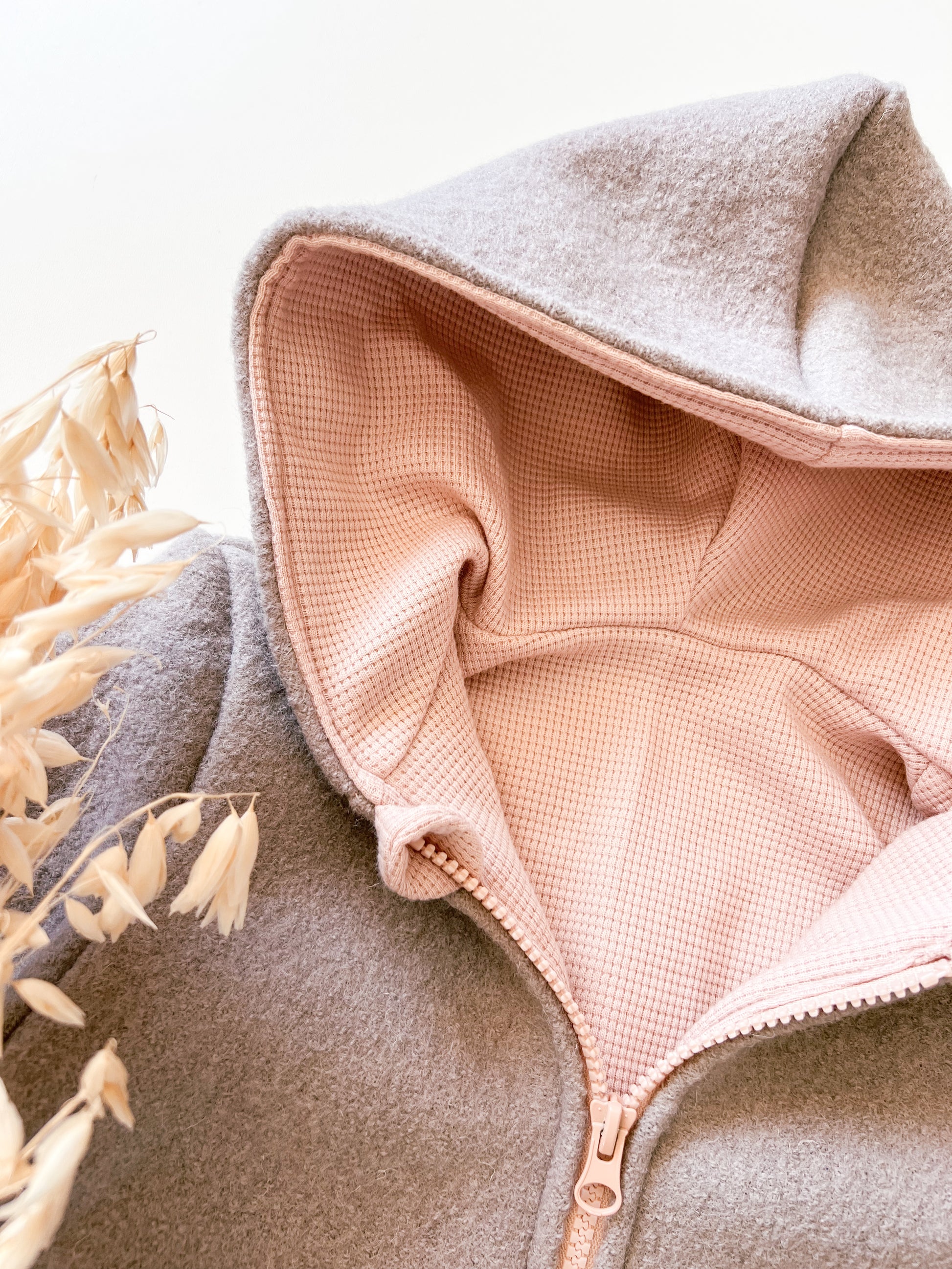 Entdecke unsere hochwertige Kinderjacke aus Schurwolle, die innen mit mauvefarbener Bio-Musselin gefüttert ist.