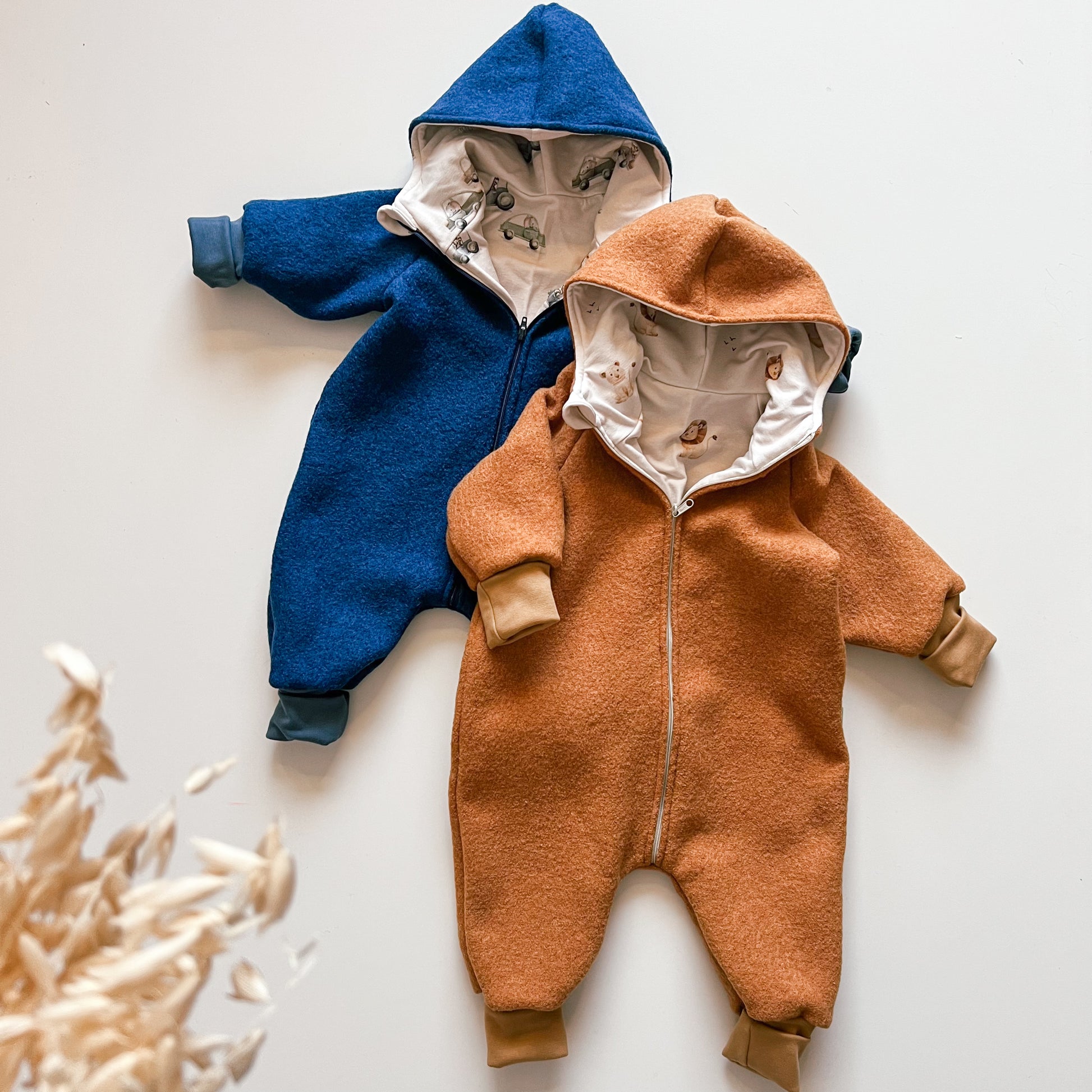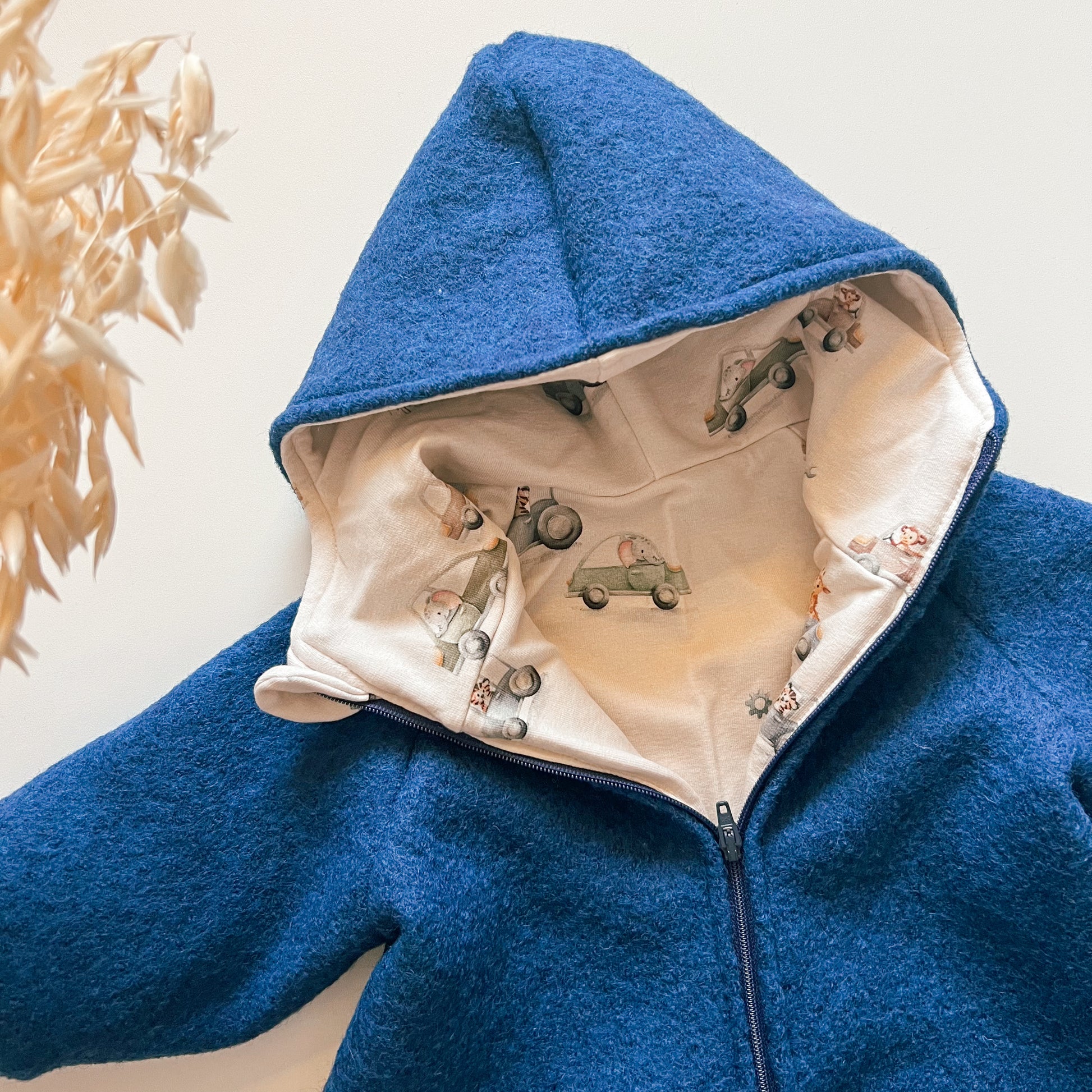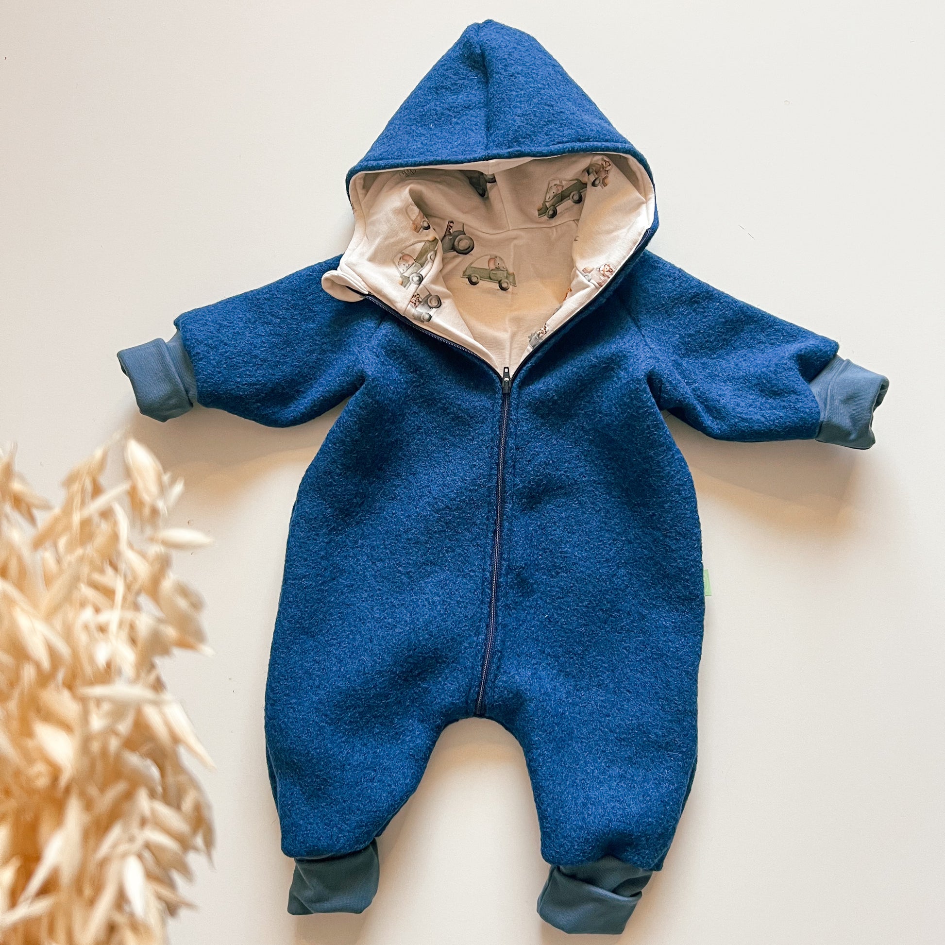 Gefütterter Walkoverall für Kinder und Babys in Blau mit Autos-Futter – aus 100% Schurwolle